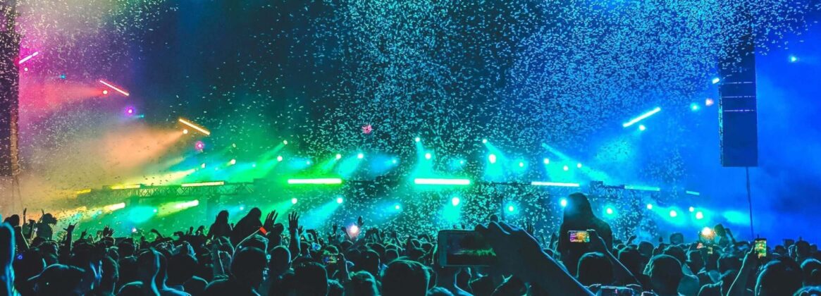 Description: The image captures the dynamic energy of a live performance. Onstage, a lead guitarist is mid-solo, fingers flying across the fretboard, while colorful stage lights create a vibrant backdrop. The audience, a sea of faces illuminated by the stage’s glow, is a mix of smiles, closed eyes lost in the music, and hands raised in applause.